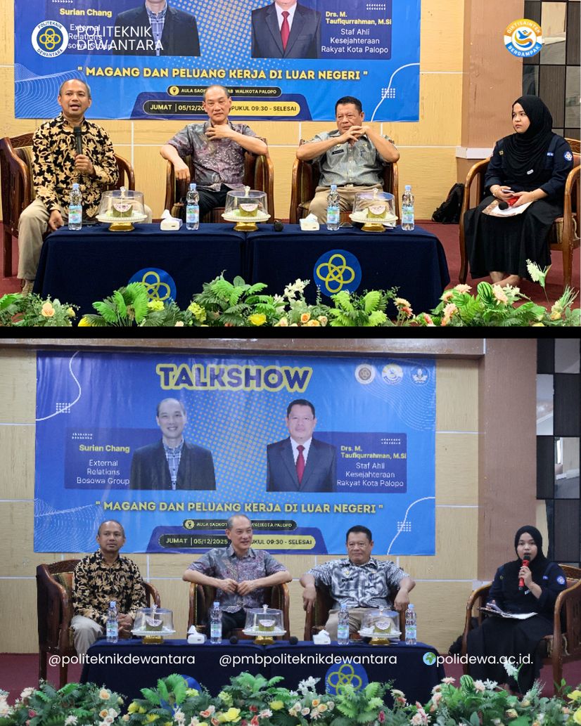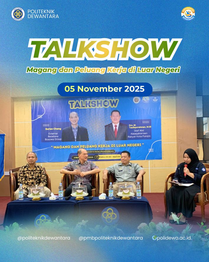 POLIDEWA – Politeknik Dewantara (Polidewa) terus menunjukkan kepeduliannya dalam membuka akses seluas-luasnya bagi mahasiswa untuk memasuki dunia kerja global. Komitmen tersebut kembali ditegaskan melalui penyelenggaraan Talkshow bertema “Magang dan Peluang Kerja di Luar Negeri” yang berlangsung di Aula Saokotae, Rumah Jabatan Wali Kota Palopo, Jl. Veteran, Jumat 5 Desember 2025.